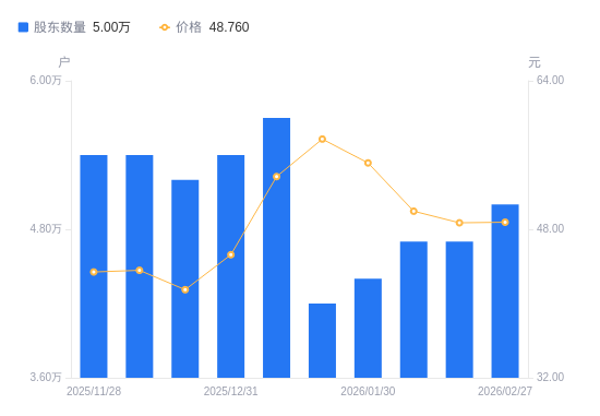 3月3日消息,数据显示,截至2026年2月27日,A股股东总户数为5万户,较上期(2026年2月13日)增加3000户,增幅6.38%。公司最新A股总股本为2.72亿股,其中流通A股2.7亿股,户均持有流通A股数量为5390.79股,较上期减少344.09股,降幅6.00%;户均持流通A股市值26.29万元,较上期减少1.64万元,降幅5.88%。