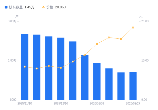 3月4日消息,数据显示,截至2026年2月27日,A股股东总户数为1.45万户,较上期(2026年2月13日)增加130户,增幅0.90%。公司最新A股总股本为2.21亿股,其中流通A股1.94亿股,户均持有流通A股数量为1.33万股,较上期减少120.1股,降幅0.89%;户均持流通A股市值26.71万元,较上期增加2.11万元,增幅8.58%。