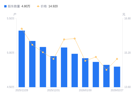 3月5日消息,数据显示,截至2026年2月27日,A股股东总户数为4.8万户,较上期(2026年2月13日)减少262户,降幅0.54%。公司最新A股总股本为2.95亿股,其中流通A股2.46亿股,户均持有流通A股数量为5116.26股,较上期增加27.78股,增幅0.55%;户均持流通A股市值7.63万元,较上期增加3009.56元,增幅4.10%。