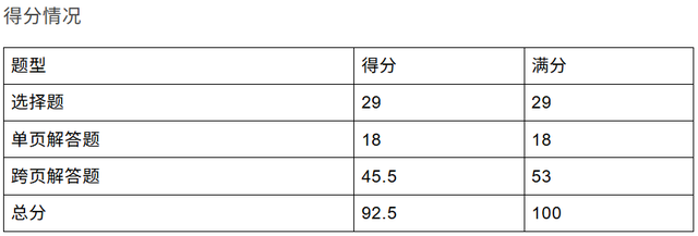答案是:AI系统得分92.5(满分100分),虽不及学生最高得分97.5分,但也远高于72分的班级平均分,且3小时的考试仅用了30分钟。