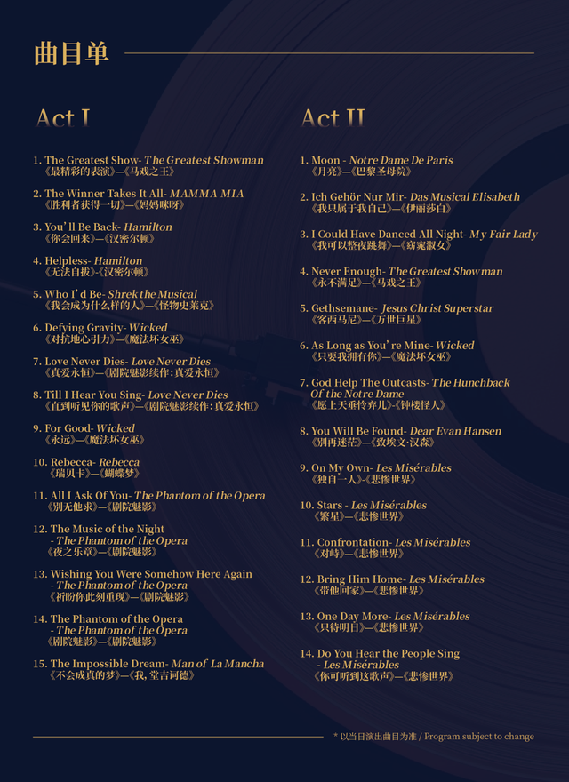 福斯特说这次带来的曲目中包括一首合作版的《剧院魅影》。 “完整音乐剧演出中,因为要扮演角色,我没法很好地跟观众互动,挺让人困扰的。但是音乐会形式就不同了,我可以尽情和观众打招呼甚至对视!”