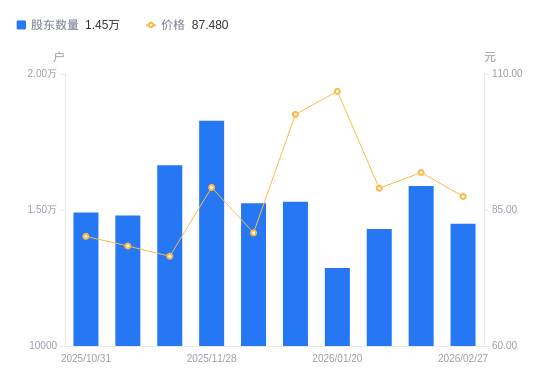 3月5日消息,数据显示,截至2026年2月27日,A股股东总户数为1.45万户,较上期(2026年2月10日)减少1385户,降幅8.72%。公司最新A股总股本为8789.02万股,其中流通A股3748.33万股,户均持有流通A股数量为2586.13股,较上期增加225.57股,增幅9.56%;户均持流通A股市值22.62万元,较上期增加9322.57元,增幅4.30%。