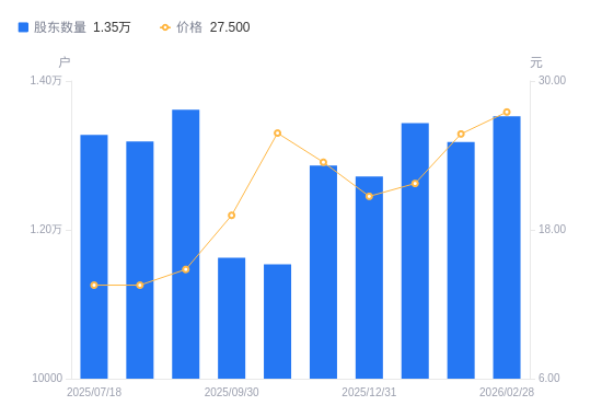 3月6日消息,数据显示,截至2026年2月28日,A股股东总户数为1.35万户,较上期(2026年2月13日)增加347户,增幅2.63%。公司最新A股总股本为2.2亿股,其中流通A股1.46亿股,户均持有流通A股数量为1.08万股,较上期减少284.92股,降幅2.57%;户均持流通A股市值29.76万元,较上期增加1.18万元,增幅4.14%。
