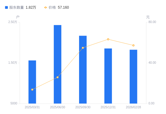 3月6日消息,数据显示,截至2026年2月28日,A股股东总户数为1.82万户,较上期(2025年12月31日)减少318户,降幅1.72%。公司最新A股总股本为4.21亿股,其中流通A股4.11亿股,户均持有流通A股数量为2.26万股,较上期增加387.57股,增幅1.75%;户均持流通A股市值129.11万元,较上期减少11.13万元,降幅7.93%。
