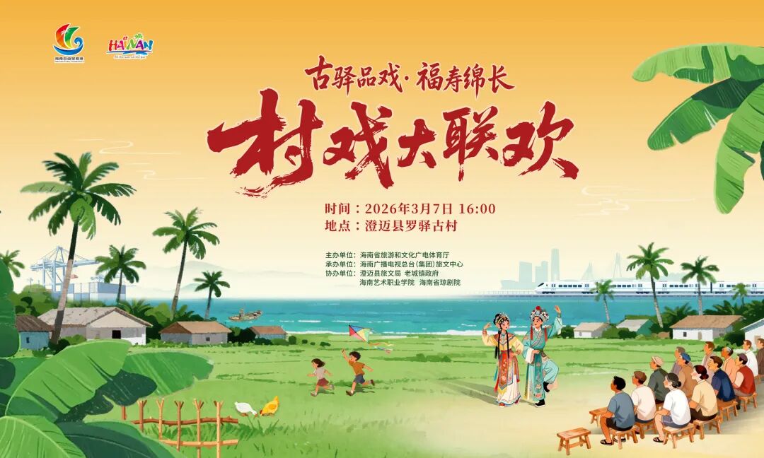 琼音声声润乡野,文艺赋美暖民心!由海南省旅游和文化广电体育厅主办的文艺赋美 琼音回响——村戏大联欢系列活动于2026年1月至4月期间精彩启幕,活动以琼剧为纽带,串联海南乡村文旅资源,让传统戏曲扎根乡村舞台,让文艺之美点亮乡村振兴之路。
