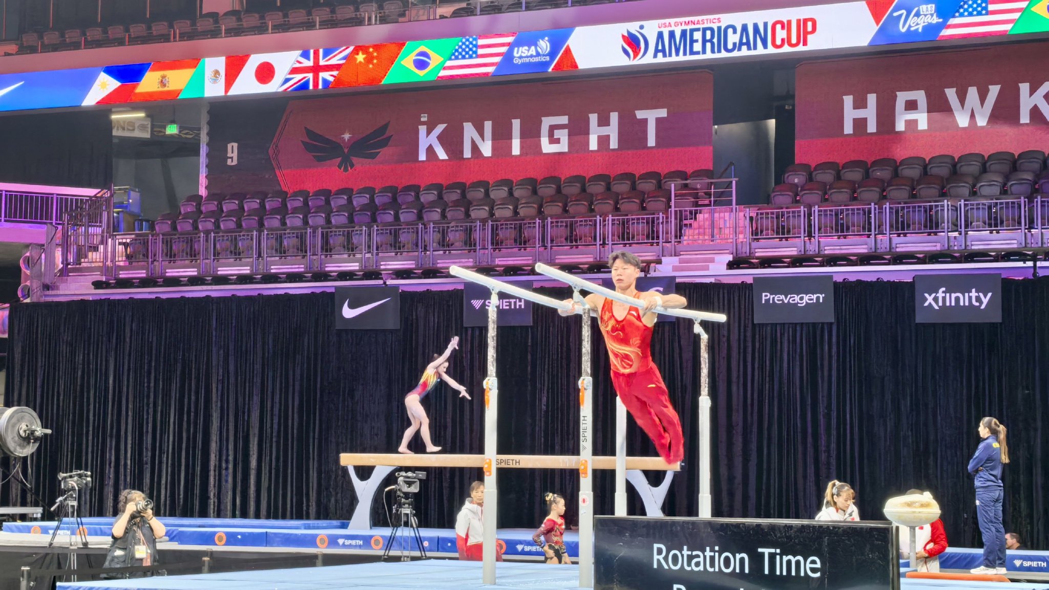 美国杯混合团体赛将于当地时间3月7日在亨德森拉开战幕,中国体操队在赛前一天完成了赛台训练。赛事组委会提供的第一轮比赛出场名单显示,中国体操队将派出男队李鸿颜、张杨煜分别出战自由体操、双杠项目,女队柯沁沁、张清颖分别出战自由体操、高低杠项目。