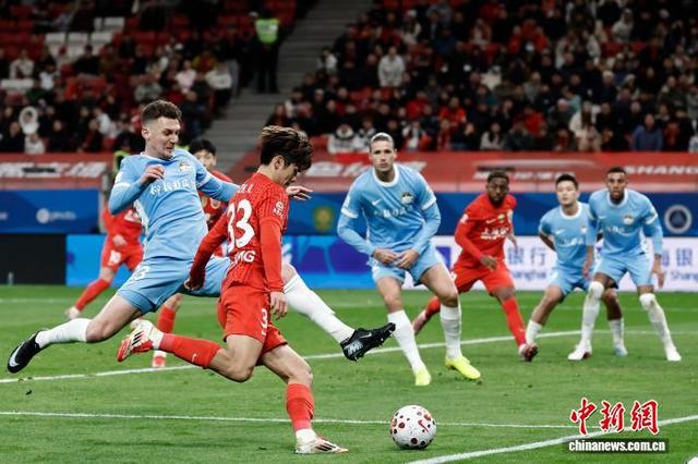 3月7日,海港队球员在比赛中进攻。当日,2026赛季中国足球超级联赛第1轮比赛中,上海海港队(红衣)主场1比2不敌河南足球俱乐部队。 中新社记者 殷立勤 摄