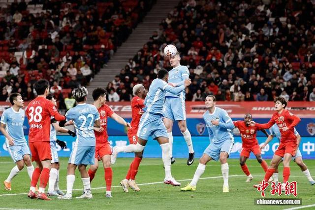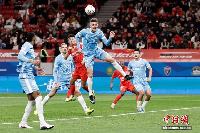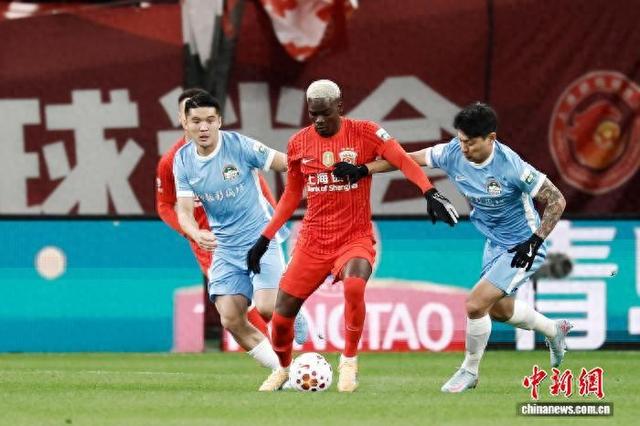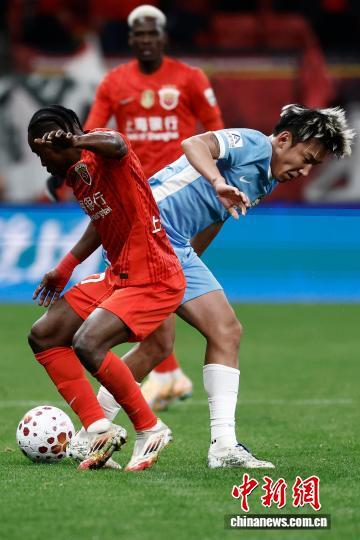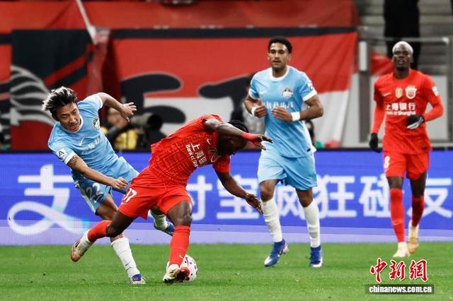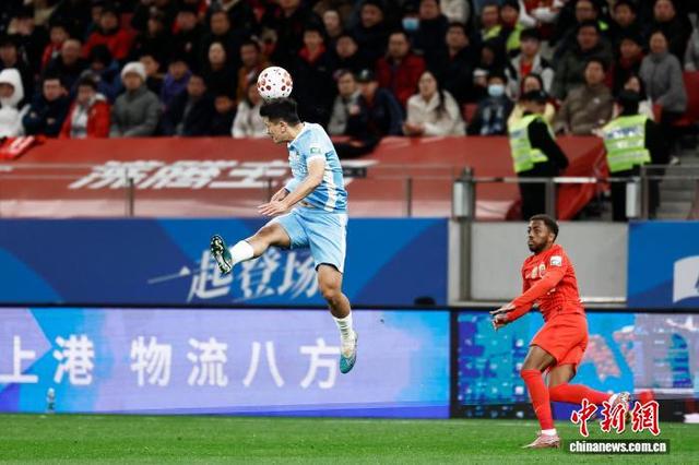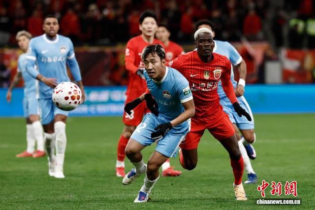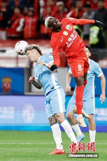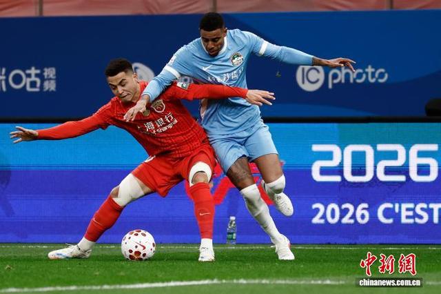 3月7日,河南足球俱乐部队球员在比赛中争球。当日,2026赛季中国足球超级联赛第1轮比赛中,上海海港队(红衣)主场1比2不敌河南足球俱乐部队。 中新社记者 殷立勤 摄