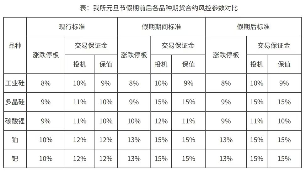 明年1月5日恢复交易后,在各品种期货持仓量最大的合约未出现涨跌停板单边无连续报价的第一个交易日结算时起,工业硅期货合约涨跌停板幅度及交易保证金标准维持不变;多晶硅、铂及钯期货合约涨跌停板幅度、交易保证金标准维持假期期间标准不变;碳酸锂期货合约涨跌停板幅度、交易保证金标准恢复至调整前水平。