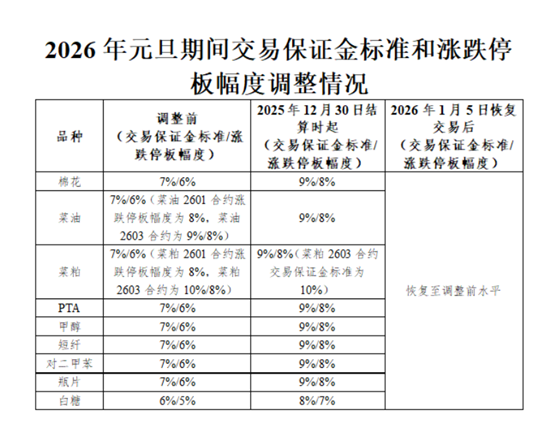 郑商所则是自下周二结算时起,棉花、菜油、菜粕、PTA、甲醇、短纤、对二甲苯、瓶片期货合约交易保证金标准和涨跌停板幅度上调;菜粕期货2603合约和白糖期货合约也出现相应调整。但在明年1月5日恢复交易后,自品种持仓量最大的合约未出现涨跌停板单边市的第一个交易日结算时起,上述品种期货合约的交易保证金标准和涨跌停板幅度恢复至调整前水平。
