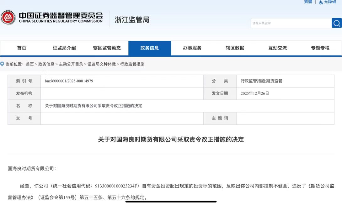 同样是公司和总经理同收罚单,国海良时期货违规集中在自有资金投资。浙江证监局开出的罚单提到,该公司自有资金投资超出规定的投资标的范围,反映出公司内部控制不健全。