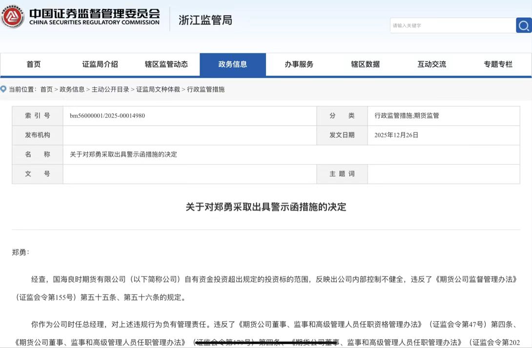 该公司时任总经理郑勇,对上述违规行为负有管理责任。浙江证监局决定采取出具警示函的监管措施,并记入证券期货市场诚信档案。