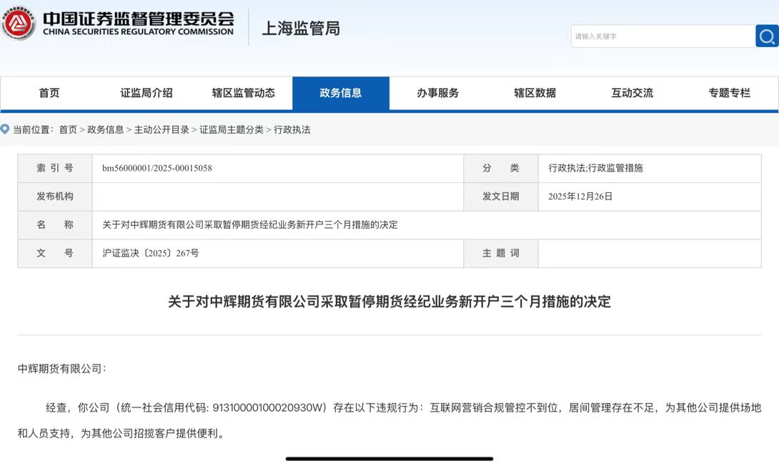 据《中华人民共和国期货和衍生品法》相关规定,上海证监局决定对中辉期货采取暂停期货经纪业务新开户三个月的监督管理措施。同时,上海证监局要求公司对相关违规行为进行全面整改,并在暂停期间届满前提交书面整改报告。经检查验收通过,依法解除上述措施后,该公司方可重新开展期货经纪业务新开户。