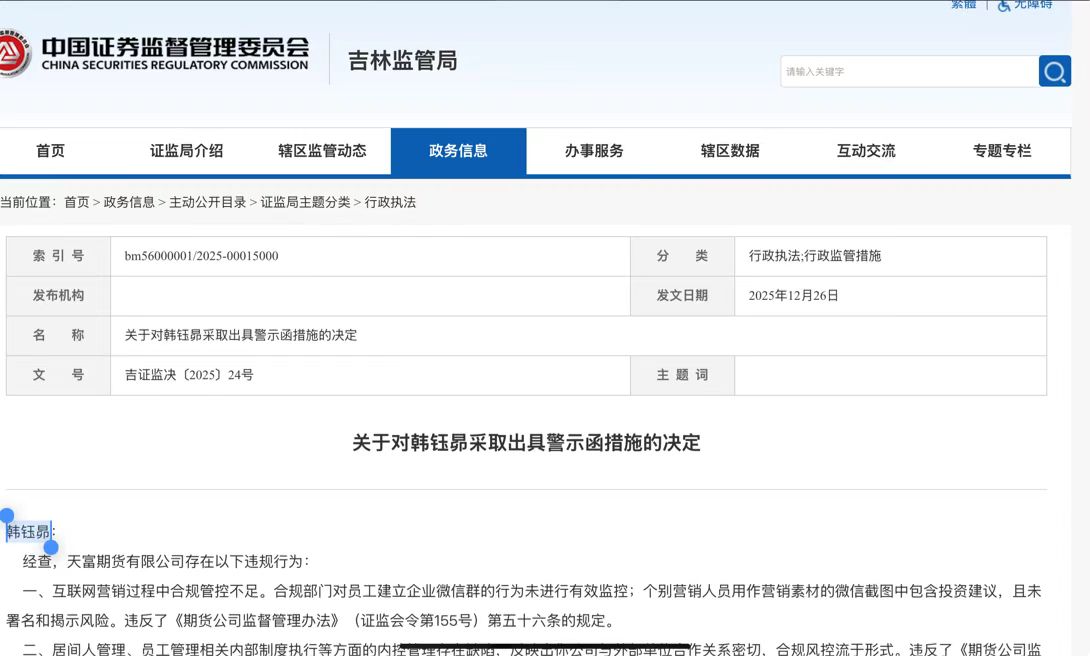 具体来看,吉林证监局表示,在互联网营销过程中合规管控不足。合规部门对员工建立企业微信群的行为未进行有效监控;个别营销人员用作营销素材的微信截图中包含投资建议,且未署名和揭示风险。