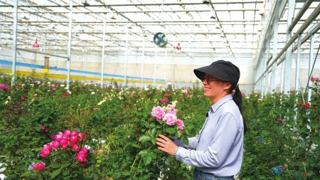 在基地里,一株插着黄色标签的月季,花瓣舒展、花色艳丽,却依旧难逃淘汰的命运。“不是它不好,而是我们有了比它更优秀的、长得类似的品种。现在我们选种,已经到了自己跟自己较量的阶段,有更好的,就一定要选最好的。”蔡艳飞伸手触摸花瓣,指尖的触感,是她多年来练就的“功夫”,捏一捏花苞,就知道这朵花能不能开到最后,仅凭触觉,就能判断花的品质。
