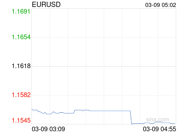 新浪外汇消息2026年03月09日,截至05时02分,外汇市场上兑美元汇率跌破1欧元兑换1.1546美元。跌幅为-0.6197%