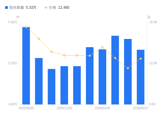 3月6日消息,数据显示,截至2026年2月27日,A股股东总户数为5.33万户,较上期(2026年2月13日)减少1048户,降幅1.93%。公司最新A股总股本为7.52亿股,其中流通A股6.89亿股,户均持有流通A股数量为1.29万股,较上期增加249.11股,增幅1.97%;户均持流通A股市值16.11万元,较上期增加1.49万元,增幅10.19%。