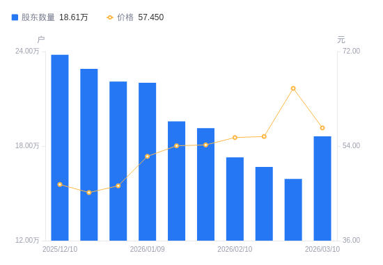 3月11日消息,数据显示,截至2026年3月10日,A股股东总户数为18.61万户,较上期(2026年2月27日)增加2.7万户,增幅16.96%。公司最新A股总股本为10.61亿股,其中流通A股10.61亿股,户均持有流通A股数量为5701.04股,较上期减少966.88股,降幅14.50%;户均持流通A股市值32.75万元,较上期减少10.58万元,降幅24.41%。
