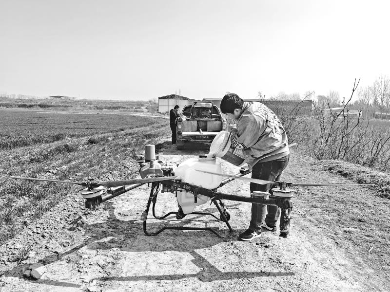 3月10日,在耀州区小丘镇坳底村,一家全程机械化综合农事服务中心的工作人员在给植保无人机灌装水溶肥,进行春季追肥作业。在今年的春耕生产中,各种新技术、智能化农业机具纷纷“上岗”,一幅幅“科技春耕图”在我市广袤的田野中铺展开来。