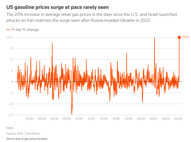 自特朗普2月28日决定联合以色列打击伊朗以来,美国平均零售汽油价格已飙升近60美分,周三达到每加仑3.58美元——短短11天内20%的涨幅,堪比四年前俄乌冲突后同期汽油价格的飙升幅度,标志着一次极为罕见的快速上涨。