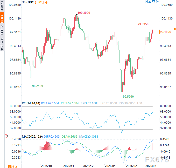 汇通财经APP讯——周四(3月12日)亚市时段,延续前两个交易日涨势,现交投于99.45附近,日内涨幅约0.2%,逼近周一创下的三个半月高点99.70。油价飙升推高通胀预期,迫使交易员重新定价全球央行路径,美元作为避险与收益资产的双重吸引力上升。