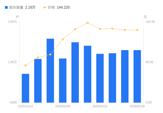 3月12日消息,数据显示,截至2026年2月28日,A股股东总户数为2.16万户,较上期(2026年2月27日)不变。公司最新A股总股本为2.13亿股,其中流通A股2.13亿股,户均持有流通A股数量为9873.21股,较上期不变;户均持流通A股市值142.39万元,较上期不变。