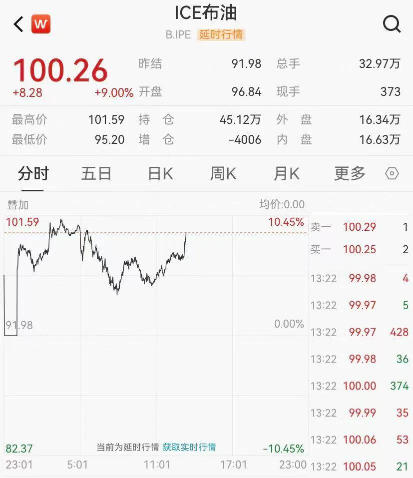 3月12日晚间,在伊朗最高领袖莫杰塔巴·哈梅内伊表示将继续关闭霍尔木兹海峡后,布伦特原油期货扩大涨幅,截至北京时间21:37涨9%触及每桶100美元。WTI原油也同步上涨超8%,报94.56美元/桶。