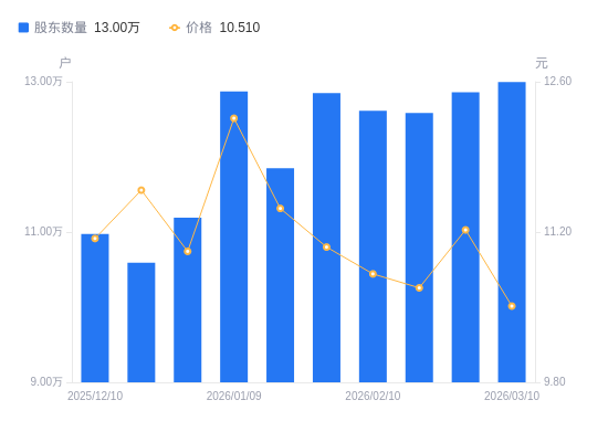 3月12日消息,数据显示,截至2026年3月10日,A股股东总户数为13万户,较上期(2026年2月27日)增加1376户,增幅1.07%。公司最新A股总股本为10.55亿股,其中流通A股10.53亿股,户均持有流通A股数量为8105.12股,较上期减少86.73股,降幅1.06%;户均持流通A股市值8.52万元,较上期减少6727.73元,降幅7.32%。