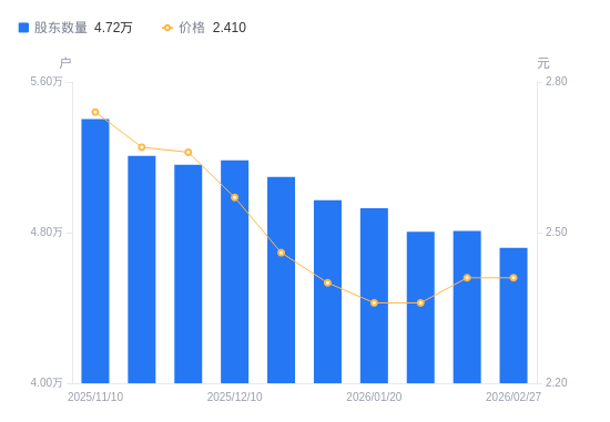 3月13日消息,数据显示,截至2026年2月10日,A股股东总户数为4.81万户,较上期(2026年1月30日)增加37户,增幅0.08%。公司最新A股总股本为16.06亿股,其中流通A股16.06亿股,户均持有流通A股数量为3.34万股,较上期减少25.71股,降幅0.08%;户均持流通A股市值8.05万元,较上期增加1608.88元,增幅2.04%。