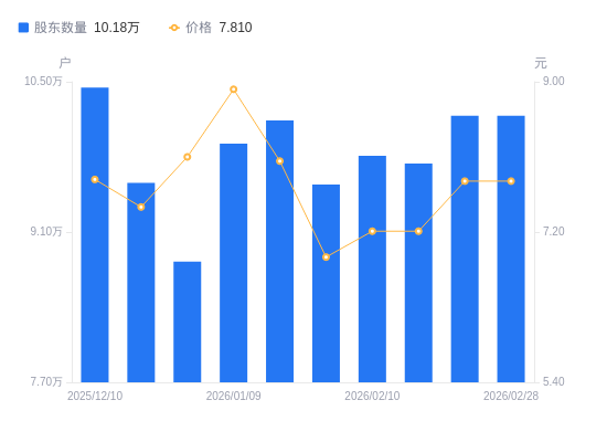3月12日消息,数据显示,截至2026年2月27日,A股股东总户数为10.18万户,较上期(2026年2月13日)增加4447户,增幅4.57%。公司最新A股总股本为10.22亿股,其中流通A股10亿股,户均持有流通A股数量为9824.5股,较上期减少448.64股,降幅4.37%;户均持流通A股市值7.67万元,较上期增加2660元,增幅3.59%。