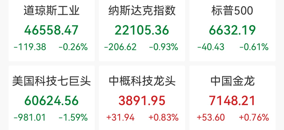 美东时间周五,美股三大指数全线收跌。道指跌0.26%报46558.47点,纳指跌0.93%报22105.36点,标普500指数跌0.61%报6632.19点。