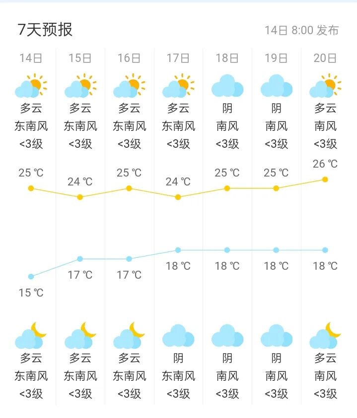 15日,多云间阴天、局地有小雨,气温17~25℃。