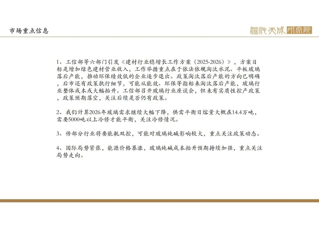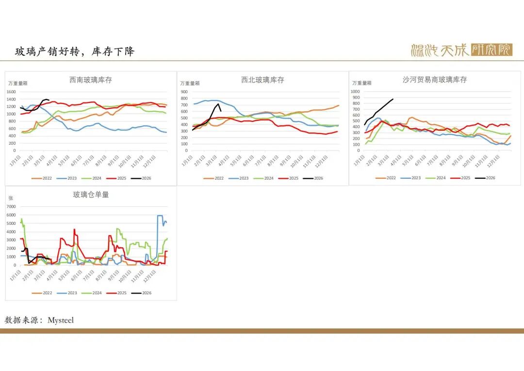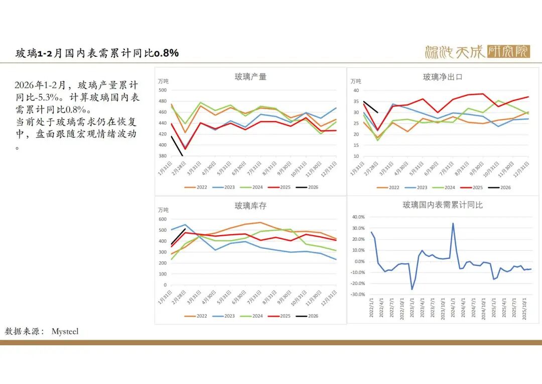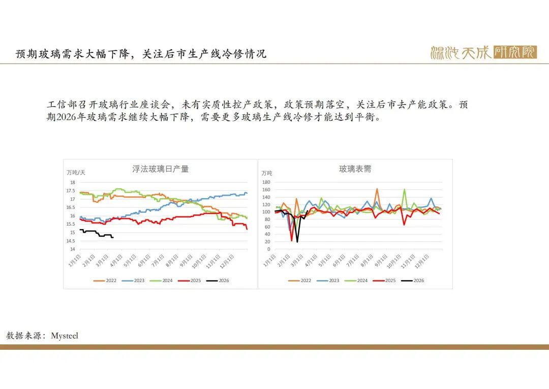 中长期矛盾:根据房地产建设周期计算,当前房地产竣工仍处于下行周期,新房玻璃需求仍在持续下滑,而二手房成交较好,汽车、家电、电子产品产量仍在增加,对玻璃需求有一定支撑,综合计算预期2026年玻璃需求仍将大幅下降,需要更多减产才能达到供需平衡。