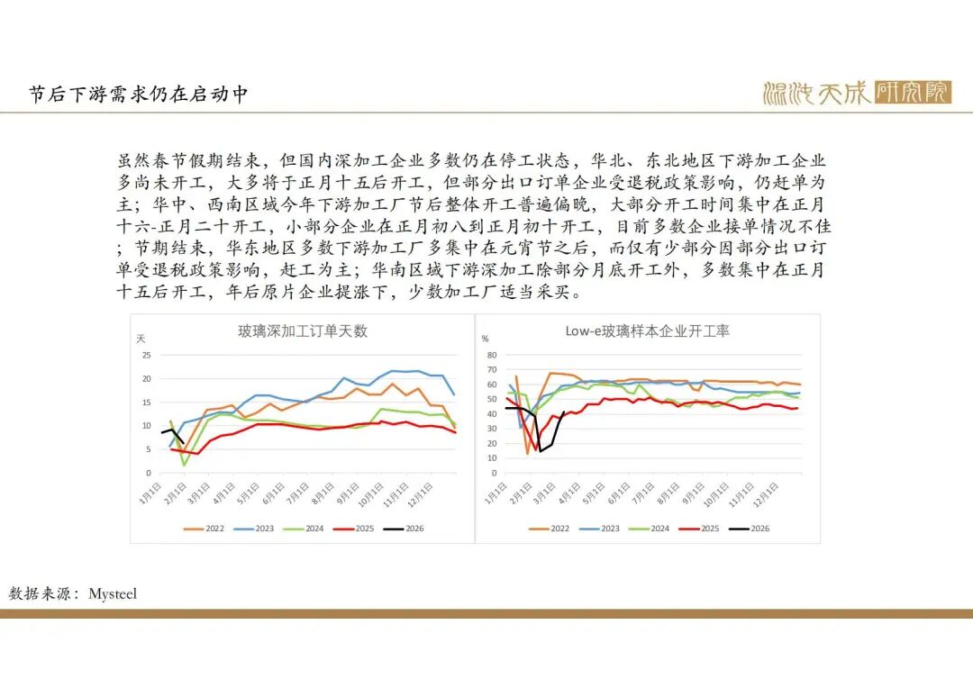 虽然春节假期结束,但国内深加工企业多数仍在停工状态,华北、东北地区下游加工企业多尚未开工,大多将于正月十五后开工,但部分出口订单企业受退税政策影响,仍赶单为主;华中、西南区域今年下游加工厂节后整体开工普遍偏晚,大部分开工时间集中在正月十六-正月二十开工,小部分企业在正月初八到正月初十开工,目前多数企业接单情况不佳;节期结束,华东地区多数下游加工厂多集中在元宵节之后,而仅有少部分因部分出口订单受退税政策影响,赶工为主;华南区域下游深加工除部分月底开工外,多数集中在正月十五后开工,年后原片企业提涨下,少数加工厂适当采买。