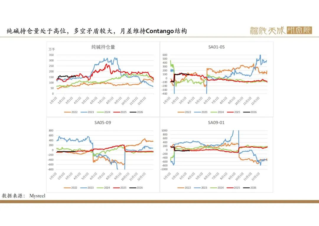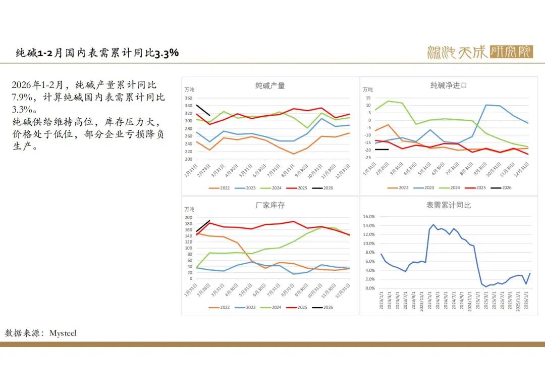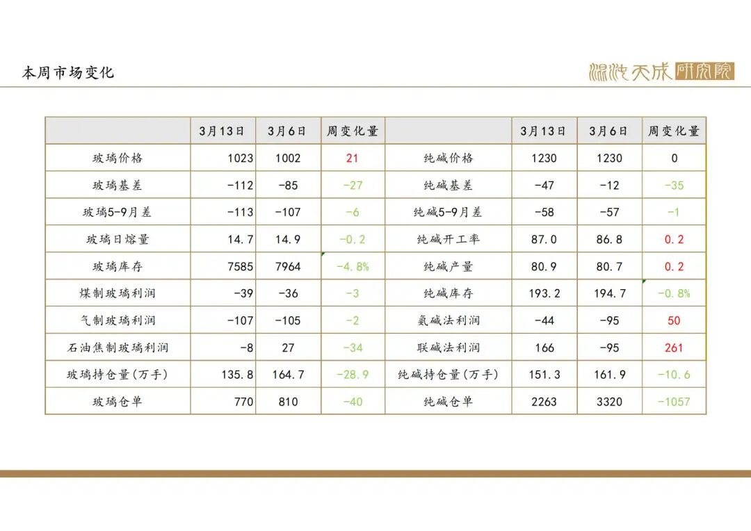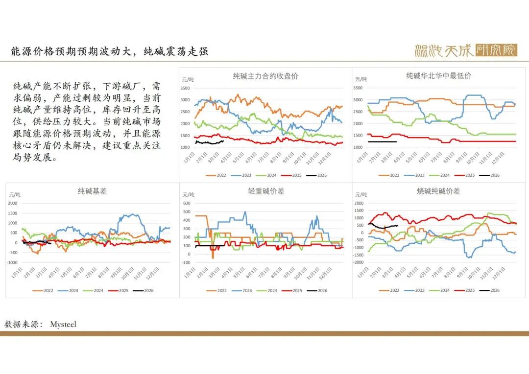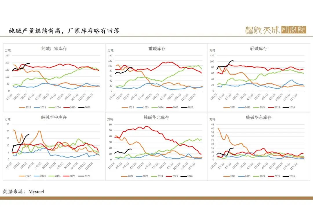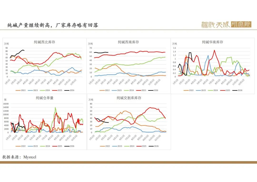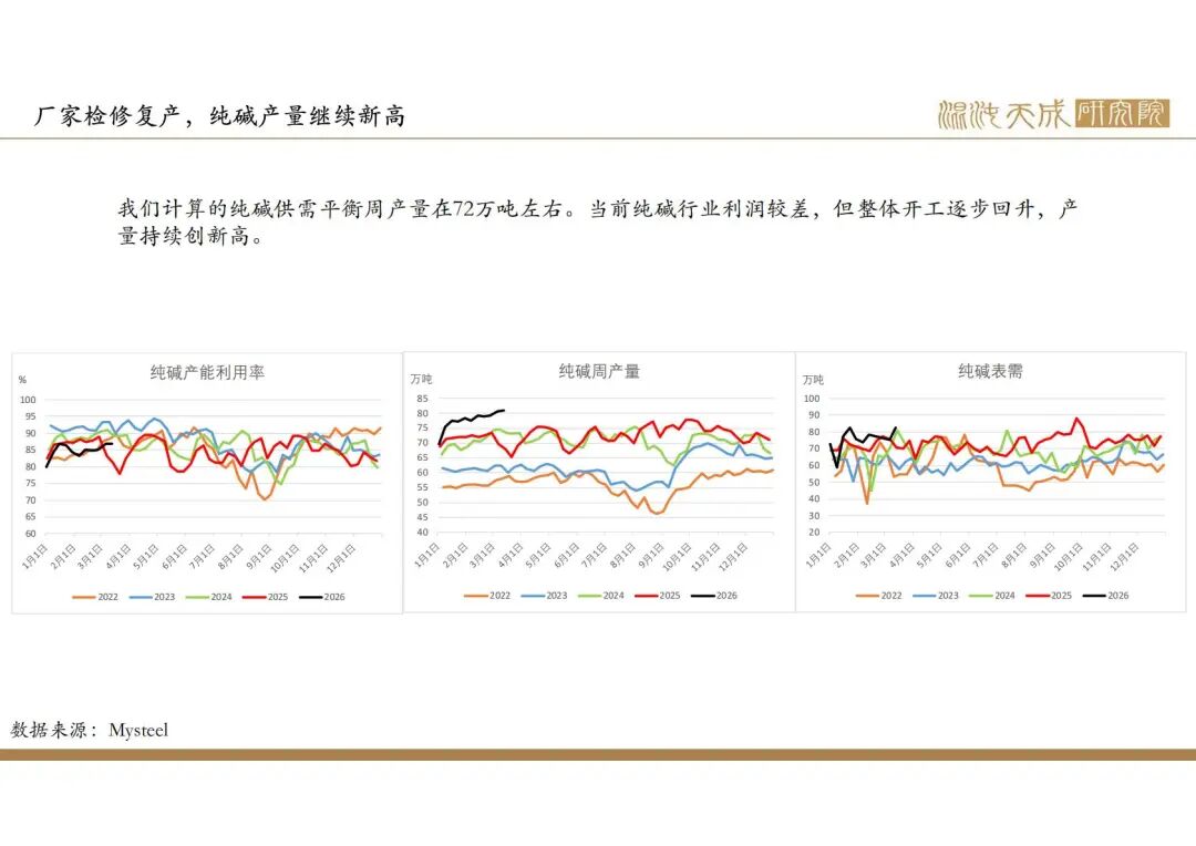 浮法玻璃弱势下跌至成本附近,产量持续下降。光伏玻璃库存回升至较高位,日熔量中位维持。烧碱价格高于纯碱,纯碱对烧碱需求有一定替代,但整体需求仍一般,没有实质性变化,当前计算纯碱周度供需平衡产量在72万吨左右。