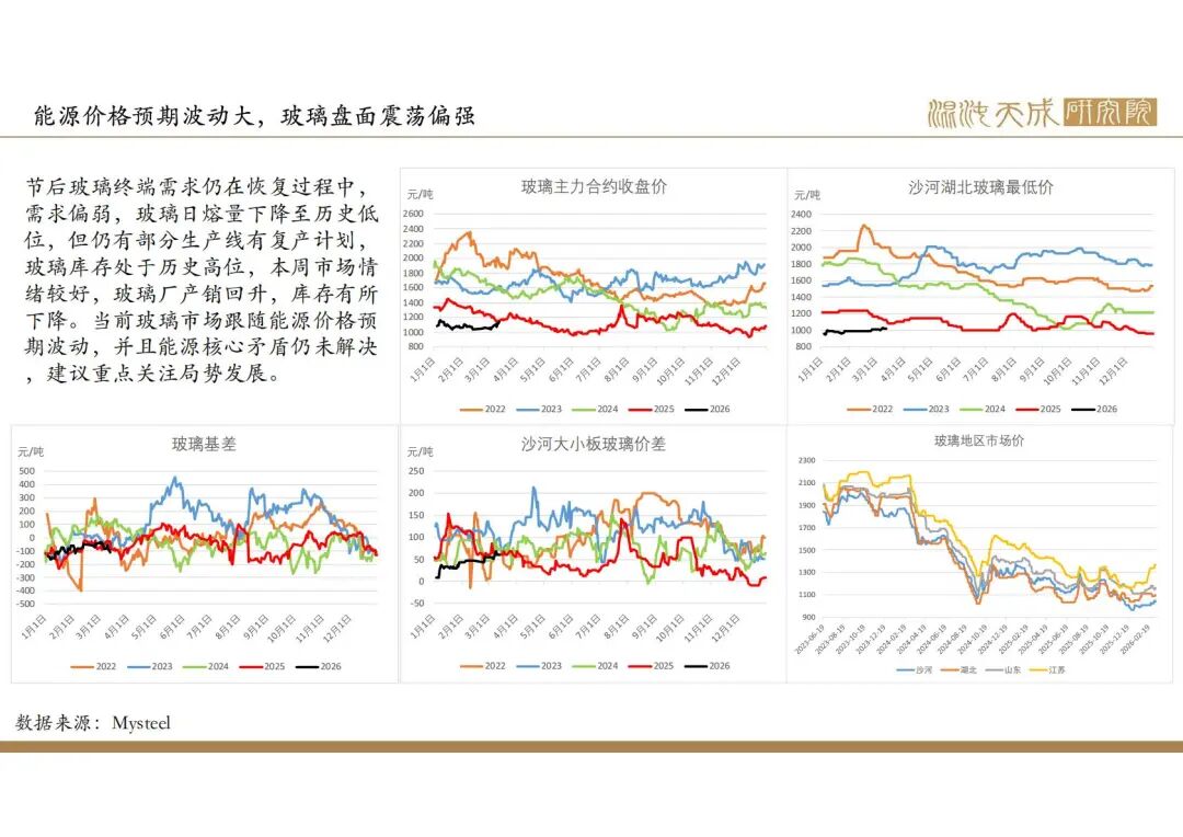 当前矛盾:节后下游需求仍在启动中,需求偏弱,玻璃日熔量处于历史低位,但仍有部分生产线有复产计划,库存处于历史高位,库存压力较大,当前玻璃市场跟随能源价格预期波动,盘面震荡偏强。目前主要矛盾仍在能源价格大幅波动,玻璃成本预期抬升,从而推动玻璃价格上涨,但玻璃的供给和库存压力巨大,一旦成本抬升预期回落,玻璃价格再次探底的概率较大,建议观望,根据能源价格预期操作。