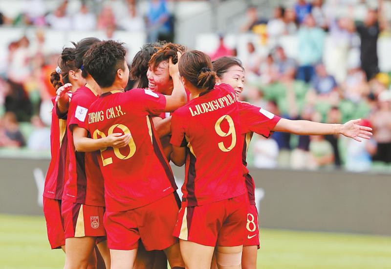高中锋邵子钦14日在多次射门受阻后终于在加时赛进球,帮助中国队最终以2∶0击败中国台北队,晋级女足亚洲杯半决赛,同时获得2027年巴西世界杯参赛资格。图为中国队球员庆祝邵子钦(右三)进球。 新华社发(周丹 摄)