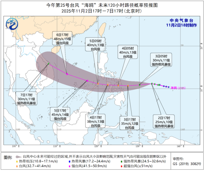 预计,“海鸥”将以每小时25-30公里的速度继续向偏西方向移动,4日穿过菲律宾中部,5日移入南海东南部海面,强度逐渐加强,最强可达强台风级(42-50米/秒,14-15级),逐渐趋向于越南中部沿海。