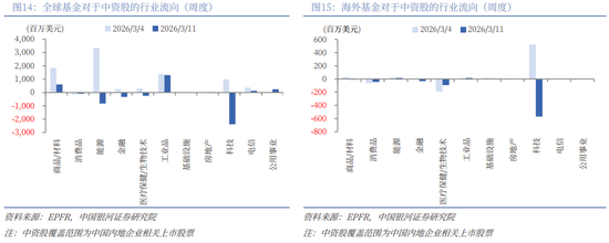 结构上,以中国内地企业在全球范围内相关上市股票的口径,观察资金对于中国资产的行业配置偏好。3月5日至3月11日期间,全球基金对工业品行业净流入规模最大,为13.04亿美元(前值为13.91亿美元),对商品/材料、公用事业行业净流入规模仅次于工业品行业,分别为6.08亿美元(前值18.36亿美元)、2.43亿美元(前值0.01亿美元),大幅净流出科技行业,对能源、金融、医疗保健/生物技术、房地产行业也由前一周的净流入转为净流出,同时持续流出消费品行业。当周海外基金净流入能源行业0.15亿美元(前值0.21亿美元),其次为工业品的0.15亿美元(前值0.11亿美元)、基础设施的0.05亿美元(前值0.14亿美元)。海外基金对于科技行业由前一周的净流入转为大幅净流出,净流出规模为5.69亿美元,同时,对于医疗保健/生物技术的净流出规模也相对靠前。