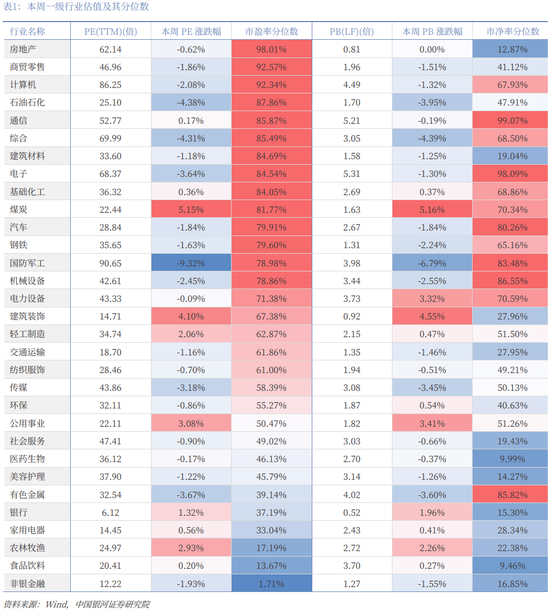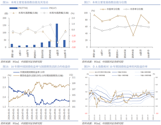 从行业层面来看,本周31个一级行业中,10个行业市盈率估值上涨。截至3月13日,从市盈率估值来看,共有22个行业估值高于2010年以来50%分位数,有6个行业的估值处于2010年以来20%-50%分位数区间,另外3个行业估值低于2010年以来20%分位数水平。其中,房地产、商贸零售、计算机的PE估值分位数较高,分别处于2010年以来98.01%、92.57%、92.34%分位数水平;非银金融、食品饮料、农林牧渔的PE估值分位数较低,分别处于2010年以来1.71%、13.67%、17.19%分位数水平。