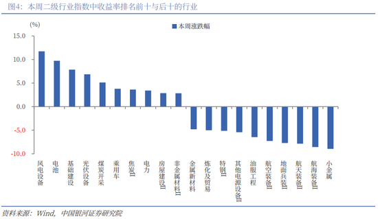 二级行业表现来看,本周收益率前五的行业依次是风电设备、电池、基础建设、光伏设备、煤炭开采;收益率靠后的行业依次是小金属、航海装备Ⅱ、航天装备Ⅱ、地面兵装Ⅱ、航空装备Ⅱ。