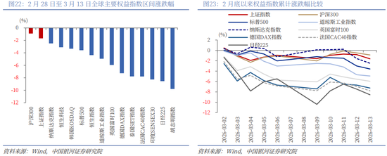 本周A股行情:(1)本周(2026年3月9日-3月13日),A股市场震荡调整,主要宽基指数表现分化。全A指数下跌0.48%。科创50、北证50跌超2%。而创业板指、深证成指、沪深300录得上涨,其中,创业板指上涨2.51%。(2)从风格来看,本周大盘风格相对占优,沪深300(0.19%)表现优于中证1000(-0.42%);五大风格指数涨跌不一,其中,周期风格跌幅靠前,下跌1.72%,而稳定风格上涨3.16%。(3)从行业来看,本周一级行业跌多涨少。煤炭、电力设备、建筑装饰涨幅靠前,国防军工、石油石化、综合跌幅靠前。