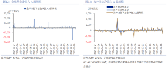 根据EPFR对于全球基金资金流向的统计,3月5日至3月11日期间,全球基金净流出A股36.15亿美元(前值为净流入14.71亿美元),净流入转为净流出。其中,海外基金净流出A股10.35亿美元(前值为净流入11.44亿美元),包括海外主动型基金净流出1.33亿美元(前值为净流入1.65亿美元)、海外被动型基金净流出9.29亿美元(前值为净流入9.90亿美元)。