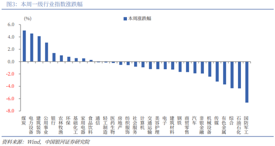 从行业来看,本周一级行业跌多涨少。涨幅靠前的三个行业分别为煤炭、电力设备、建筑装饰,涨幅分别为5.03%、4.55%、4.12%。国防军工、石油石化、综合跌幅靠前。