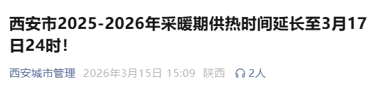 据气象部门预报,西安市16日夜间至17日有一次降水、降温天气过程,18日起气温逐步回升。为确保群众用热需求,经市政府同意,将原定于3月15日24时结束的供热时间延长至3月17日24时。延长供热期间,不再向居民用户另行收取费用。