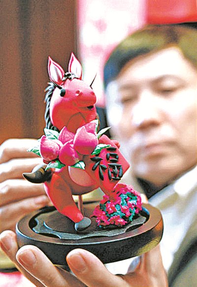 “这款‘马上送福寿’是今年我设计的新款生肖面人,一匹红马抱着寿桃与福字,也是有丙午马年福寿到之意。”