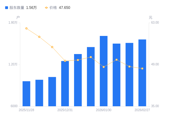 3月16日消息,数据显示,截至2026年3月10日,A股股东总户数为1.53万户,较上期(2026年2月27日)减少300户,降幅1.92%。公司最新A股总股本为11.67亿股,其中流通A股11.67亿股,户均持有流通A股数量为7.63万股,较上期增加1466.8股,增幅1.96%;户均持流通A股市值357.5万元,较上期增加1.04万元,增幅0.29%。