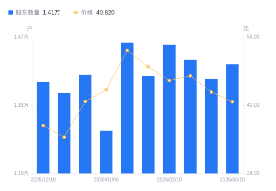 3月16日消息,数据显示,截至2026年3月10日,A股股东总户数为1.41万户,较上期(2026年2月27日)增加301户,增幅2.17%。公司最新A股总股本为1.73亿股,其中流通A股1.05亿股,户均持有流通A股数量为7409.74股,较上期减少161.14股,降幅2.13%;户均持流通A股市值30.25万元,较上期减少2.39万元,降幅7.33%。