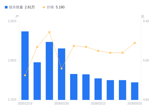 3月18日消息,数据显示,截至2026年2月28日,A股股东总户数为2.83万户,较上期(2026年2月27日)不变。公司最新A股总股本为10.56亿股,其中流通A股10.56亿股,户均持有流通A股数量为3.74万股,较上期不变;户均持流通A股市值18.98万元,较上期不变。