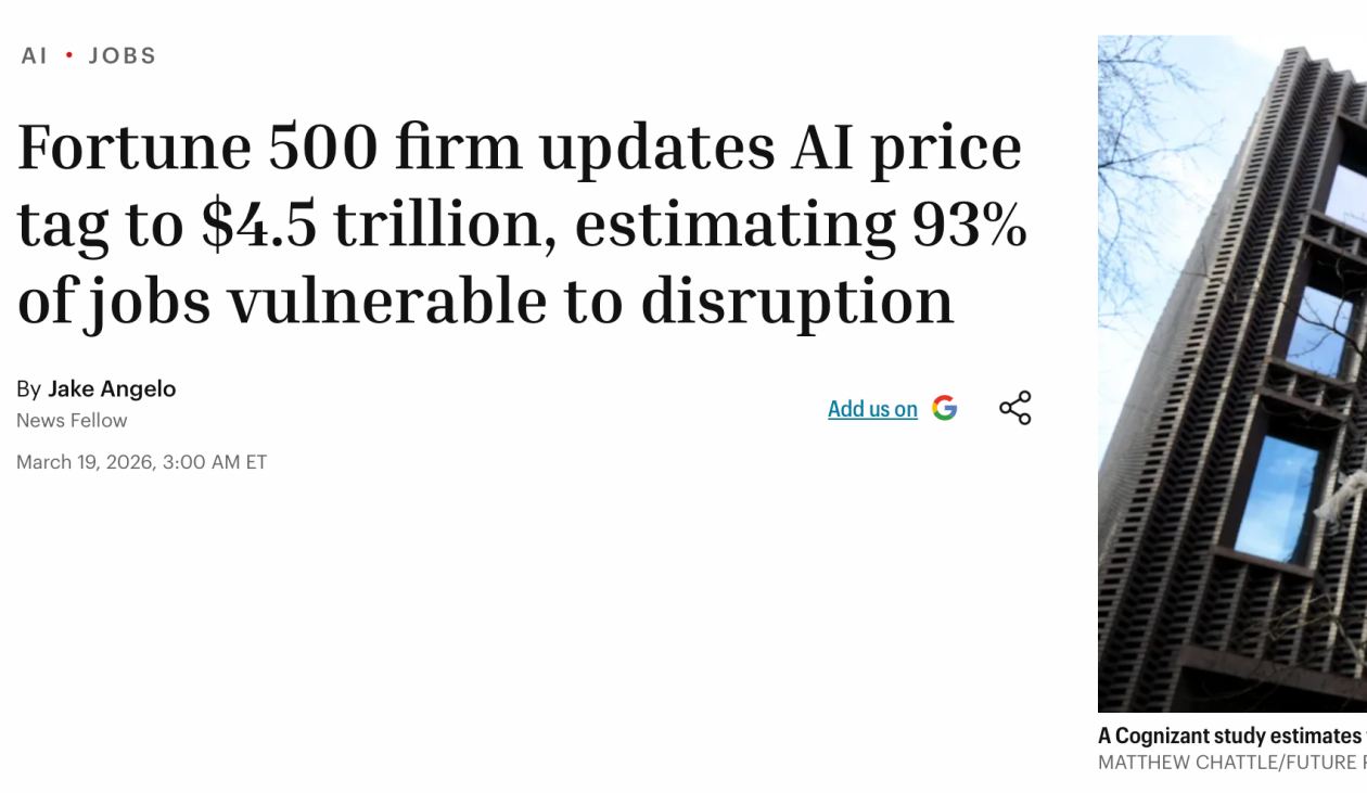 【环球网财经综合报道】据《财富》杂志报道,人工智能技术落地加速,对全球职场的影响远超市场预期。Cognizant最新研究显示,93%的工作岗位可能受到AI不同程度的影响,AI驱动的变革或将涉及价值约4.5万亿美元的劳动力转移,相关进程较原预测提前六年到来。